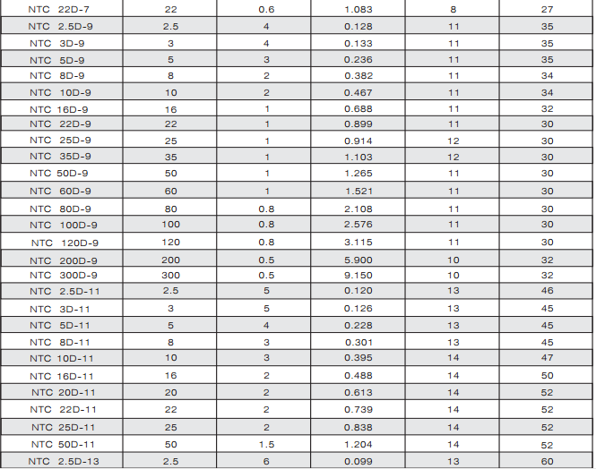 NTC熱敏電阻器:是以錳、鈷、鎳和銅等金屬氧化物為主要材料,采用陶瓷工藝制造而成的。NTC熱敏電阻器在室溫下的變化范圍在10°歐姆~10⒍歐姆,溫度系數(shù)-2%~-6.5%。它具有電阻值隨溫度的上升而下降的特性。適用于轉換電源、開關電源、UPS電源、各類電加熱器、電子節(jié)能燈、電子鎮(zhèn)流器、各種電子裝置電源電路的保護以及彩色顯示管、白熾燈及其他照明燈具的燈絲保護。