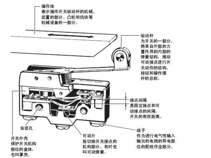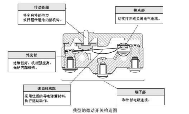 微動(dòng)開關(guān)由5個(gè)大類的構(gòu)成要素組成。