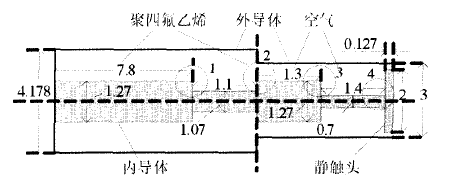 2 . 2 SMA接口及相連同軸結構參數(shù)的提取SMA接口內(nèi)外導體間填充聚四氟乙烯作為絕緣介質(zhì),與SMA接口相連的同軸部分應用空氣作