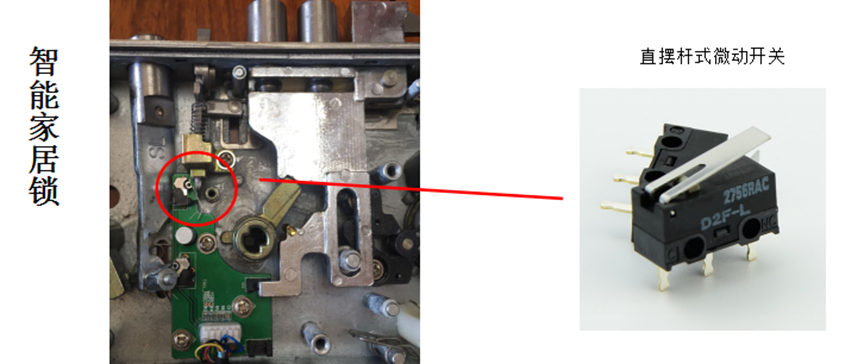 而微動開關(guān)在智能鎖中的作用不容小覷,它在智能鎖中主要用來檢測鎖舌的位置,告知目前門鎖的狀態(tài)——是開鎖狀態(tài)還是關(guān)鎖狀態(tài),從而向電機發(fā)送驅(qū)動信號,推動或拉回鎖桿。對于智能鎖而言,微動開關(guān)是至關(guān)重要的存在,若微動開關(guān)失效,那么整個鎖體將失靈,住戶安全將得不到保障。微動開關(guān)通常又分為直擺桿型和R型擺桿兩種類型。