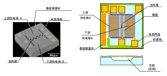 MEMS 流量傳感器芯片的基本結(jié)構(gòu)如圖 3 所示。這種傳感器芯片采用使用熱線的質(zhì)量流量檢測方式。其芯片中央具有加熱器,上游側(cè)的熱電堆 (A)及下游側(cè)熱電堆 (B)配置在加熱器的兩側(cè),熱電堆附近配置有基座測溫體,它們均是采用半導體工藝制造的。加熱器和熱電堆列組的底部形成空腔,使得熱電堆可高效檢測加熱器的熱量。