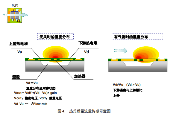 如圖 4 所示,恒定電流流向芯片中央的加熱器,產(chǎn)生熱量。無風時,加熱器周圍的熱分布是對稱的,因此 Vu 和 Vd 兩個熱電堆的電動勢相等。