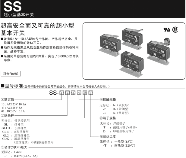所以,對于微動開關品牌的選擇還是不能馬虎的,鼎悅小編為您推薦世界知名品牌歐姆龍微動開關:具有超高安全、超長壽命、超小尺寸的微動開關SS系列。 具體技術參數: