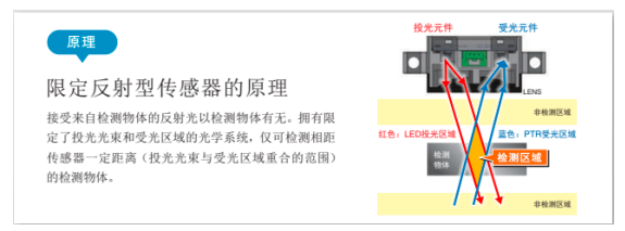B5W-LB系列是限定反射型傳感器(如圖三),搭載了由4種超環(huán)面透鏡組成的歐姆龍自行設(shè)計(jì)的光學(xué)鏡頭。只需微弱的反射光即可實(shí)現(xiàn)穩(wěn)定檢測(cè),不易受檢測(cè)物體的顏色和表面狀態(tài)影響,可在廣泛檢測(cè)區(qū)域內(nèi)檢測(cè)黑紙和透明玻璃等。