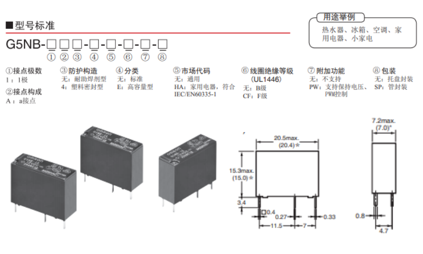 G5NB功率繼電器是一款多樣化選擇的繼電器,耐沖擊電壓10kV的1極3A/5A開(kāi)閉的小型功率繼電器,采用了高功率電磁回路,實(shí)現(xiàn)高靈敏度(200/mW)同時(shí)去獲得了UL、CSA、VDE的認(rèn)證,用途符合EN61010強(qiáng)化絕緣標(biāo)準(zhǔn)要求,歐姆龍G5NB-()-PW型的支持電壓,PWM控制,有助于節(jié)能,一下是G5NB的一個(gè)型號(hào)標(biāo)準(zhǔn),尺寸;