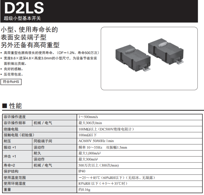 歐姆龍D2LS系列開關(guān),高荷重型也擁有達到500萬次的電氣壽命,超級小型身材,寬度8.6*進深4.8*3.0mm尺寸,為設(shè)備節(jié)省安裝面積,觸感良好,容許操作速度1~500mm/s,操作頻率最大300次/min,重量僅有0.16g。