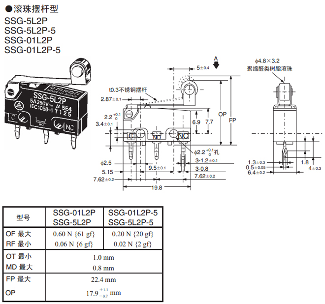 | 滾珠擺桿型 | 焊接端子 | 0.60 N {61 gf} | SSG-5L2H | SSG-01L2H |