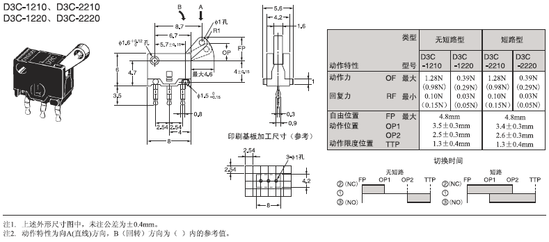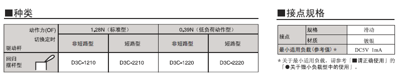 D3C 超級小型檢測開關(guān) 采用滑動式的超小型開關(guān) 超小型(高6×寬8×深4.2mm),輕量(約0.3克),3mm的長行程。 由于是滑動方式,所以短路、非短路的切換時間可根據(jù)使用用途進(jìn)行選擇。