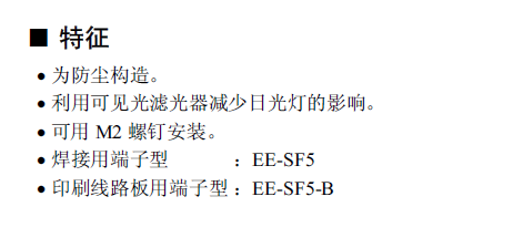 EE-SF5 微型光電傳感器[反射型] 為防塵構造。 利用可見光濾光器減少日光燈的影響。 可用M3 螺釘安裝。 焊接用端子型:EE-SF5 印刷線路板用端子型:EE-SF5-B