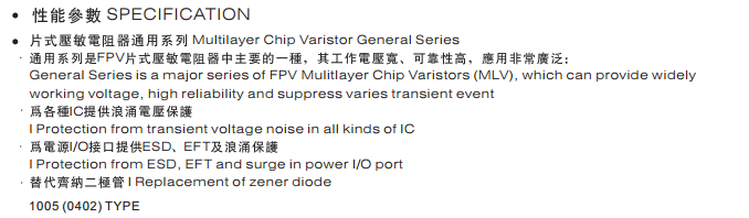特征: 1、疊層片式陶瓷結(jié)構(gòu)。 2、無引線。 3、溫度范圍:-55℃~+125 ℃。 4、工作電壓范圍V w(dc)=3.3~ 615V。 5、具有雙向限制特性,適合ESD保護(hù)。 6、漏電流非常小。 7、寄生電感小、響應(yīng)速度快(響應(yīng)時間少于0.5ns)。 8、優(yōu)良的溫度系數(shù)。 9、良好的焊接性能(端電極為三層電鍍)。 應(yīng)用: 1、防止過電壓:當(dāng)施加的電壓升高到壓敏電壓時,壓敏電阻器的電流急劇上升,被保護(hù)設(shè)備的浪涌電壓迅速減小,從而使裝有壓敏電阻器的設(shè)備抗浪涌噪聲能力達(dá)到相應(yīng)要求。